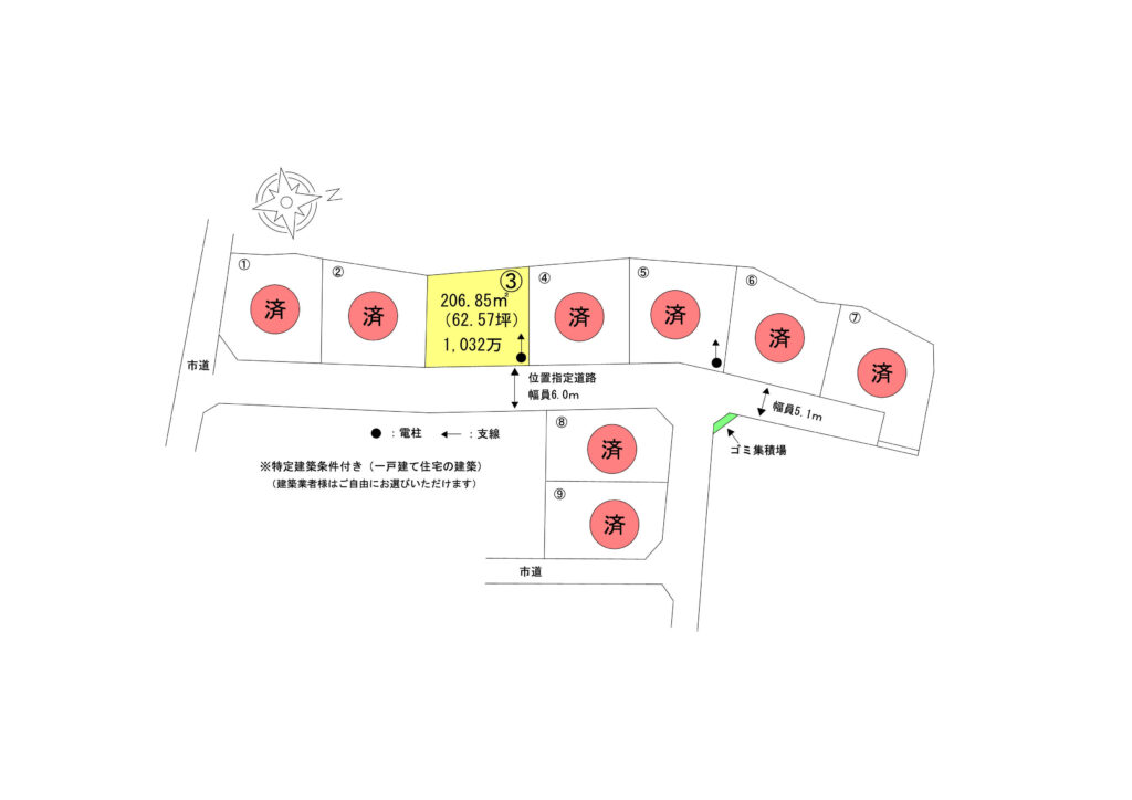 この土地は、土地売買契約締結後3ヶ月以内に建設業者と建築請負契約を締結することを条件に販売いたします。この期間内に建築請負契約が締結されなかった場合は、土地売買契約は白紙となり、受領した金銭は全てお返しいたします。